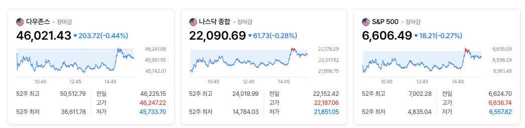 | 다우 | 46,021.43 | -0.44% | 경기민감주와 전통주가 더 무거운 흐름 |