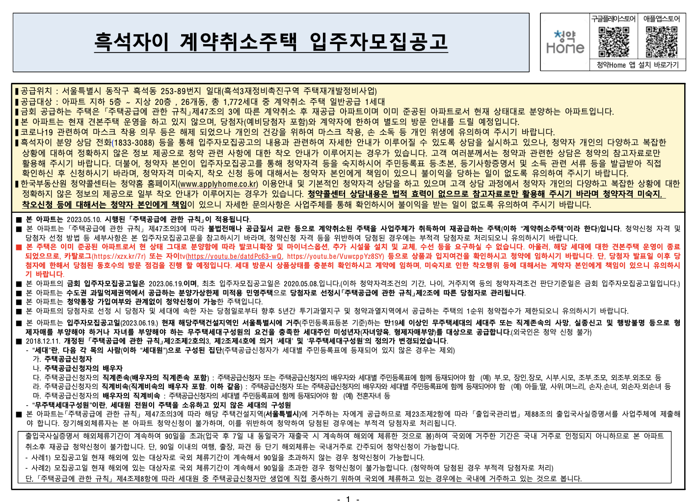 계약취소분: 84 타입(서울거주 무주택자)