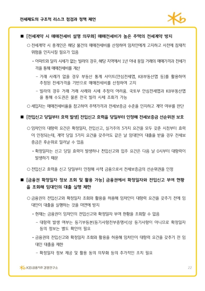 - 임대인 신원 및 체납여부 확인 의무화, 전세계약 시 매매전세비 설명 의무화, 전입신고 당일부터 효력, 금융권 확정일자 조회 및 활용