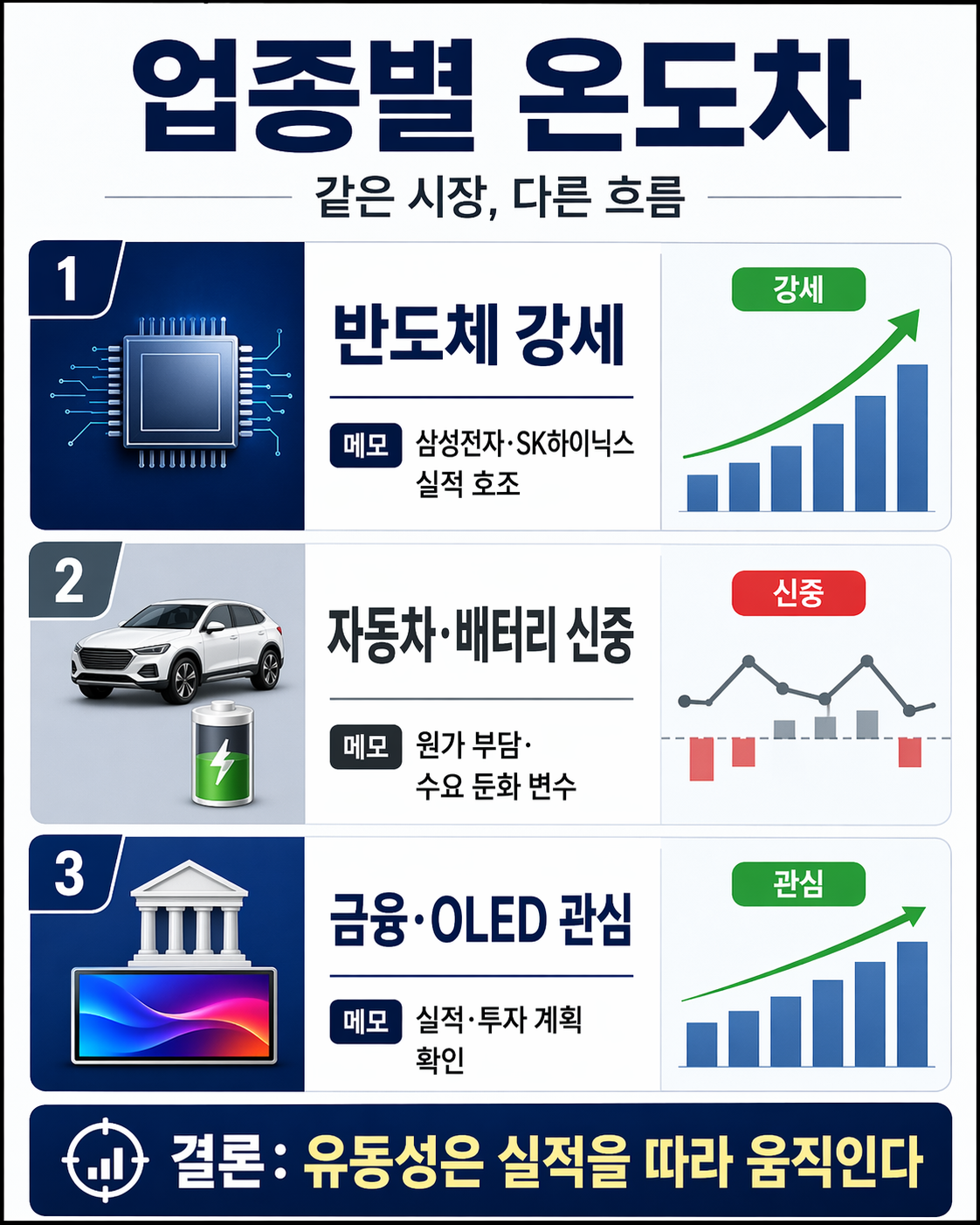 기업 공시와 최근 뉴스는 반도체 강세, 자동차 이익 둔화, OLED 투자 확대, 금융 실적 개선이라는 업종별 온도 차를 보여준다. (SK hynix Newsroom -)