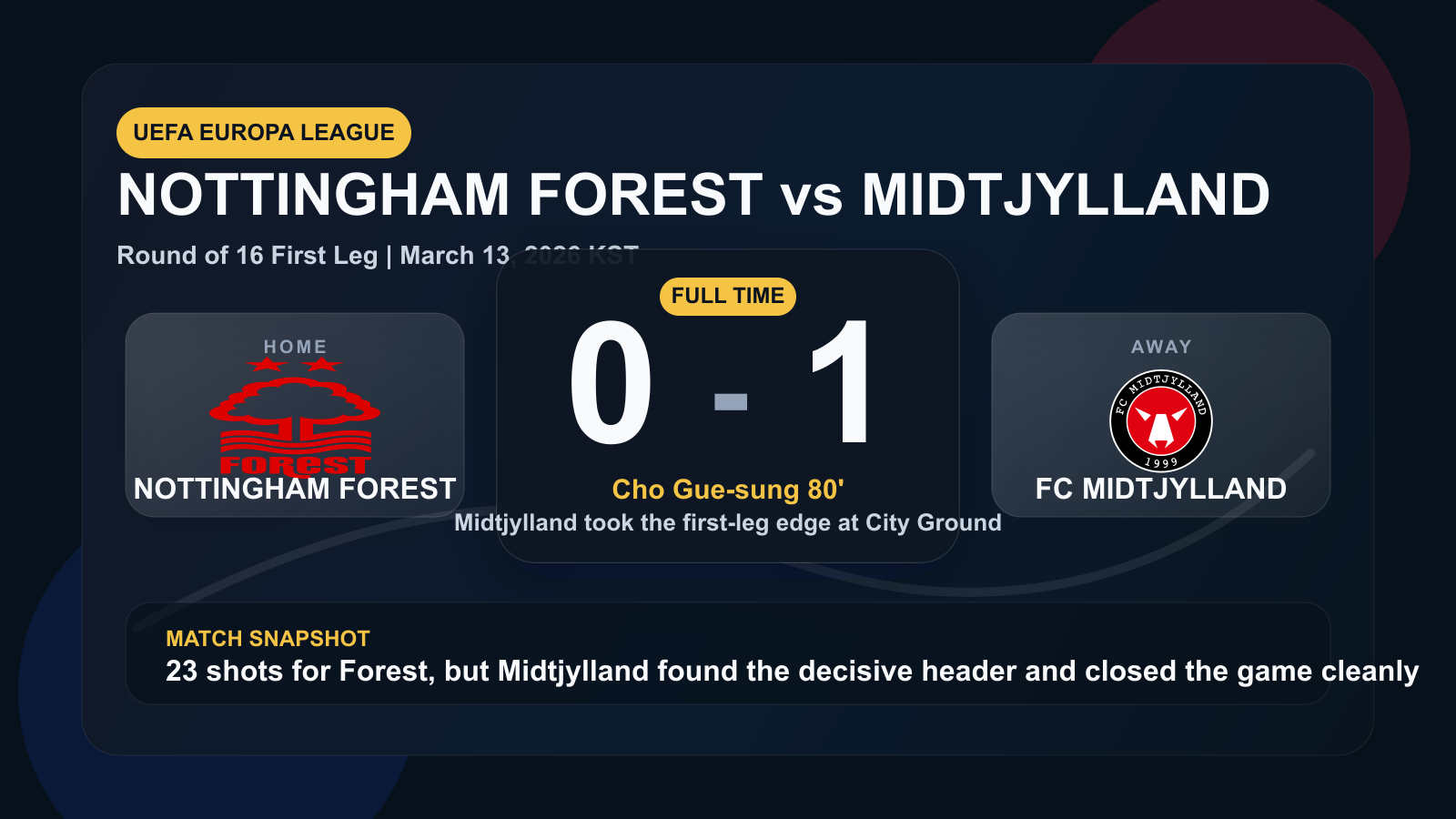 대표 이미지는 경기 스코어보드용 커스텀 그래픽이며, 팀 로고는 [Nottingham Forest logo - Footylogos](https://www.footylogos.com/clubs/nottingham-forest-logo/)와 [FC Midtjylland logo - Logotyp.us](https://logotyp.us/logo/midtjylland/) 공개 자료를 참고해 재구성했습니다.