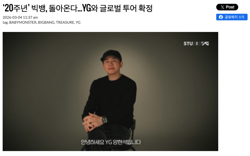 3월 4일 YG 공식 블로그는 2026 YG 플랜을 공개했습니다. 여기에는 빅뱅 20주년 글로벌 투어, 베이비몬스터와 트레저 활동, 새 보이그룹 준비 계획이 담겼습니다.