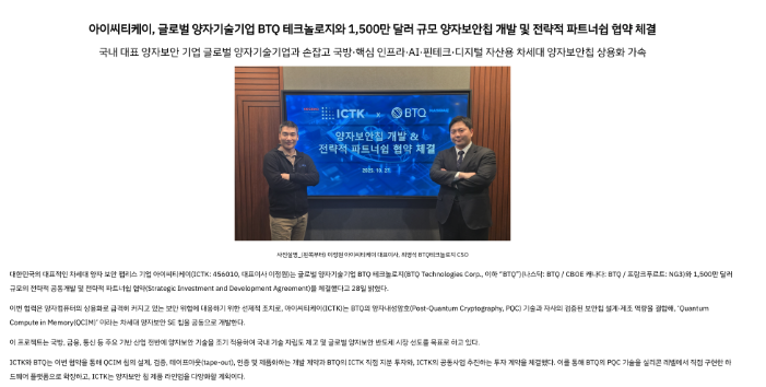 같은 흐름은 회사 공식 발표에서도 확인됩니다. 아이씨티케이는 2025년 10월 29일 BTQ와 1,500만 달러 규모 공동개발 및 전략적 파트너십 협약을 체결했다고 밝혔고, 이를 통해 QCIM 칩을 함께 개발한다고 설명했습니다.
