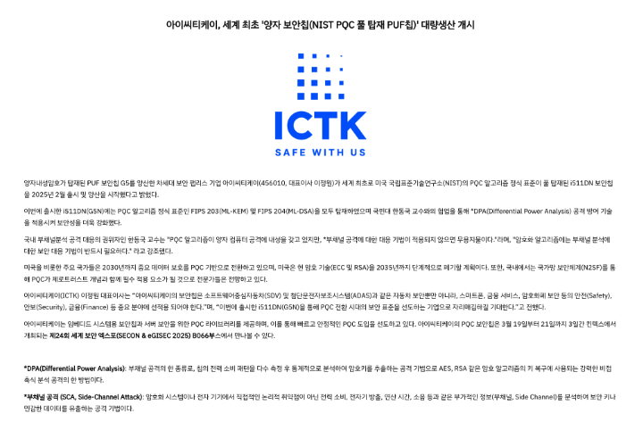 아이씨티케이는 2025년 3월 5일 공식 발표에서 미국 표준 양자내성암호를 모두 넣은 보안칩 i511DN, 즉 G5N을 2025년 2월 출시하고 양산을 시작했다고 밝혔습니다.