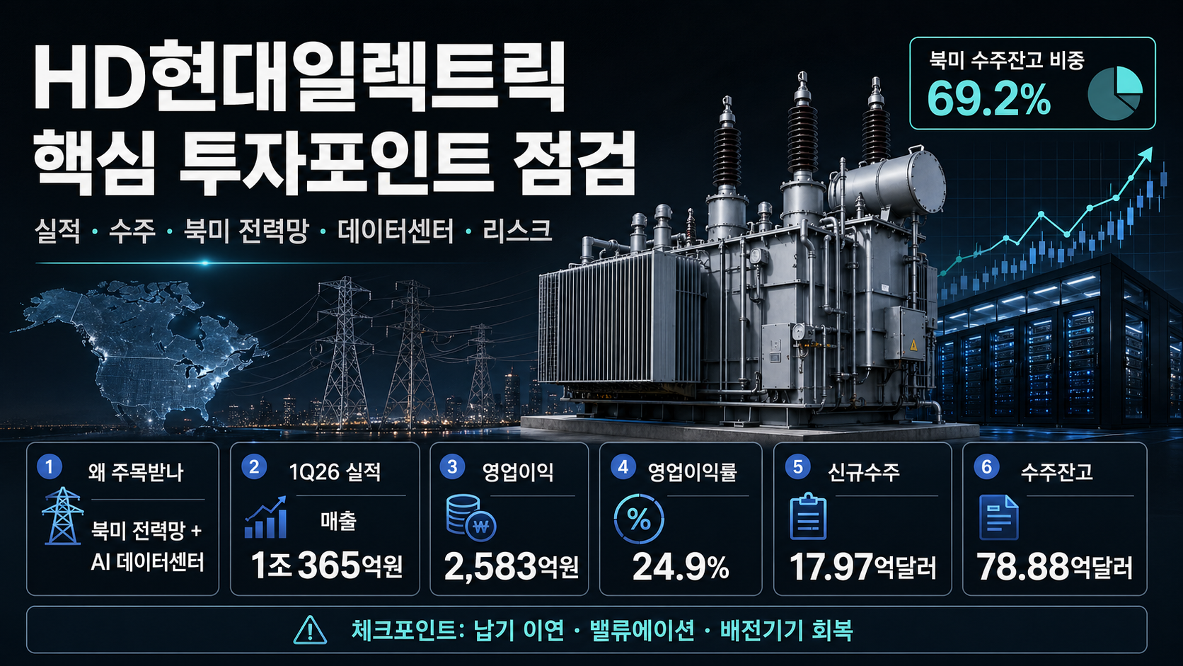수주잔고가 늘어나는 것도 중요하지만, 더 중요한 것은 마진이 높은 초고압 변압기 중심인지 여부다. 북미 비중이 계속 60~70% 수준을 유지하는지도 봐야 한다.