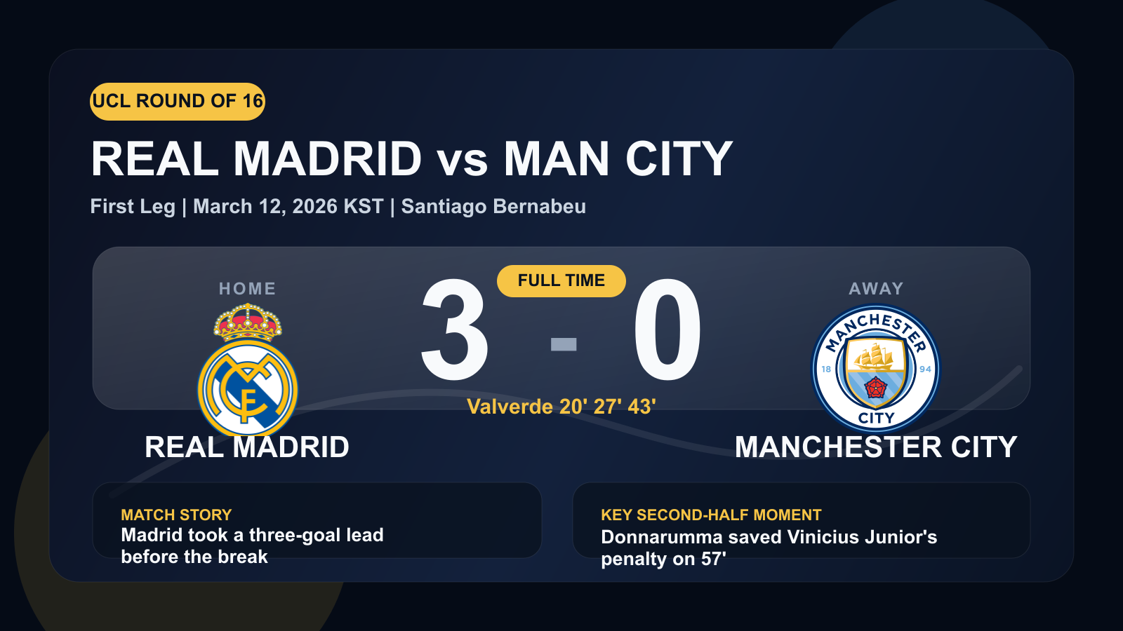 한국시간 2026년 3월 12일 새벽의 레알 마드리드 vs 맨체스터 시티 16강 1차전은 레알이 왜 챔피언스리그 토너먼트에서 늘 위험한 팀인지 다시 보여준 경기였습니다. 발베르데가 전반 20분, 27분, 43분 연속 골로 해트트릭을 완성했고, 레알은 그 23분 동안 시리즈 전체의 방향을 자기 쪽으로 돌려놨습니다.