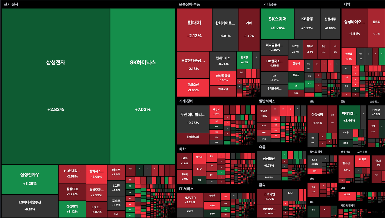 반면, 시장의 온기가 모든 곳에 퍼지지는 않았습니다. 현대차(-2.13%), 기아(-1.40%), 삼성바이오로직스(-1.51%), LG에너지솔루션(-0.81%) 등 자동차와 바이오, 2차전지 대장주들은 오히려 하락하며 대조적인 모습을 보였습니다.