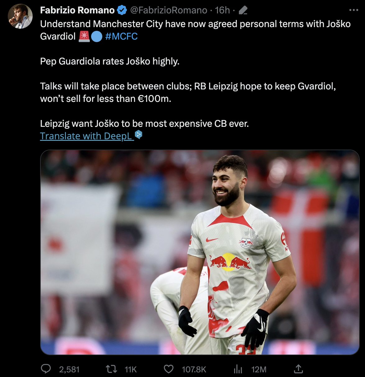 맨시티와 라이프치히의 그바르디올간에 개인합의가 완료되었습니다.