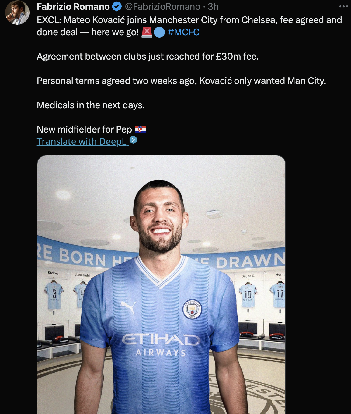 마테오 코바치치, 첼시에서 맨체스터 시티로 이적, 이적료 합의 및 계약 완료