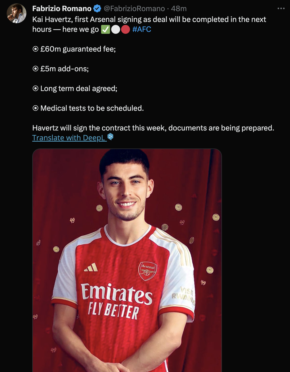 카이 하베르츠, 아스널의 첫 번째 영입 계약이 몇 시간 안에 완료될 예정입니다