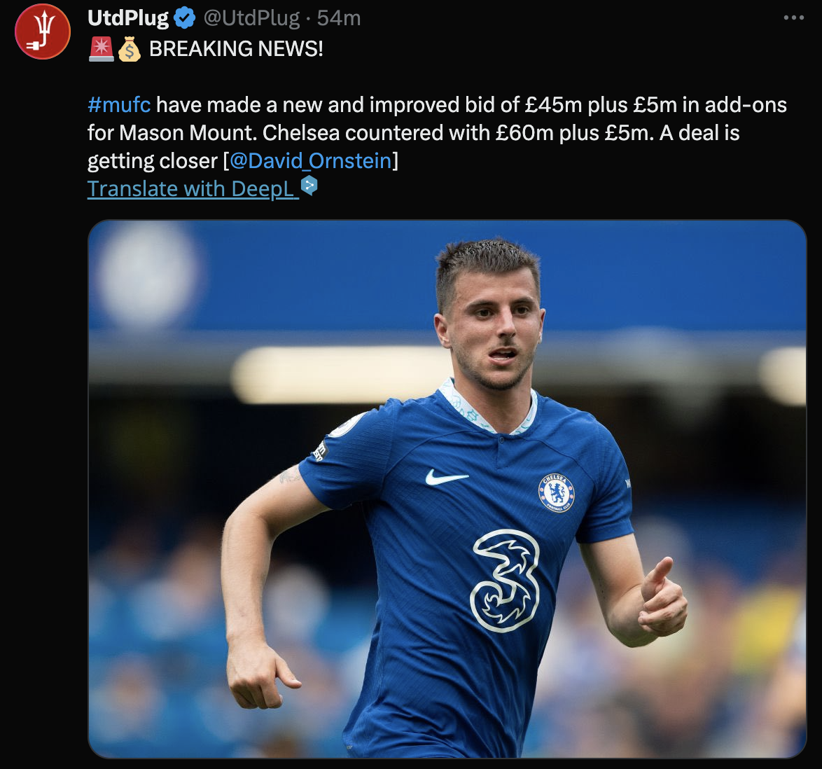 맨유가 메이슨 마운트 영입을 위해 4,500만 파운드에 500만 파운드를 추가해 새로운 제안을 했습니다.