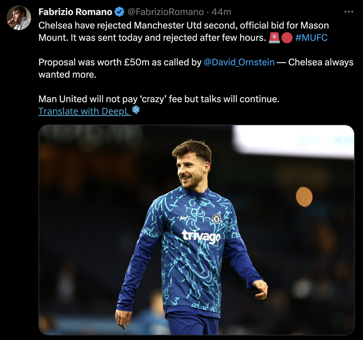 첼시가 맨체스터 유나이티드의 두 번째  공식 메이슨 마운트 영입 제안을 거절했습니다.