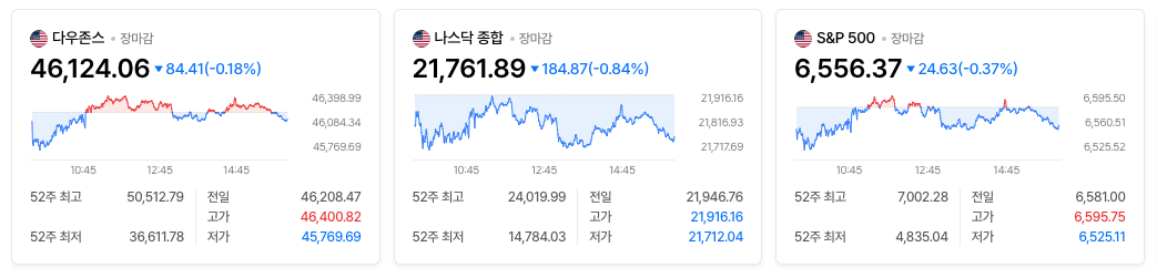 | 다우 존스 | 46,124.06 | -0.18% | 경기 방어주 위주로 상대적 선방 |