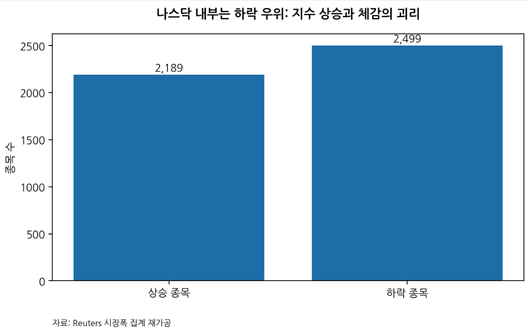 오늘 시장의 성격은 “넓은 상승”이 아니라 “좁은 지수 방어”였습니다.