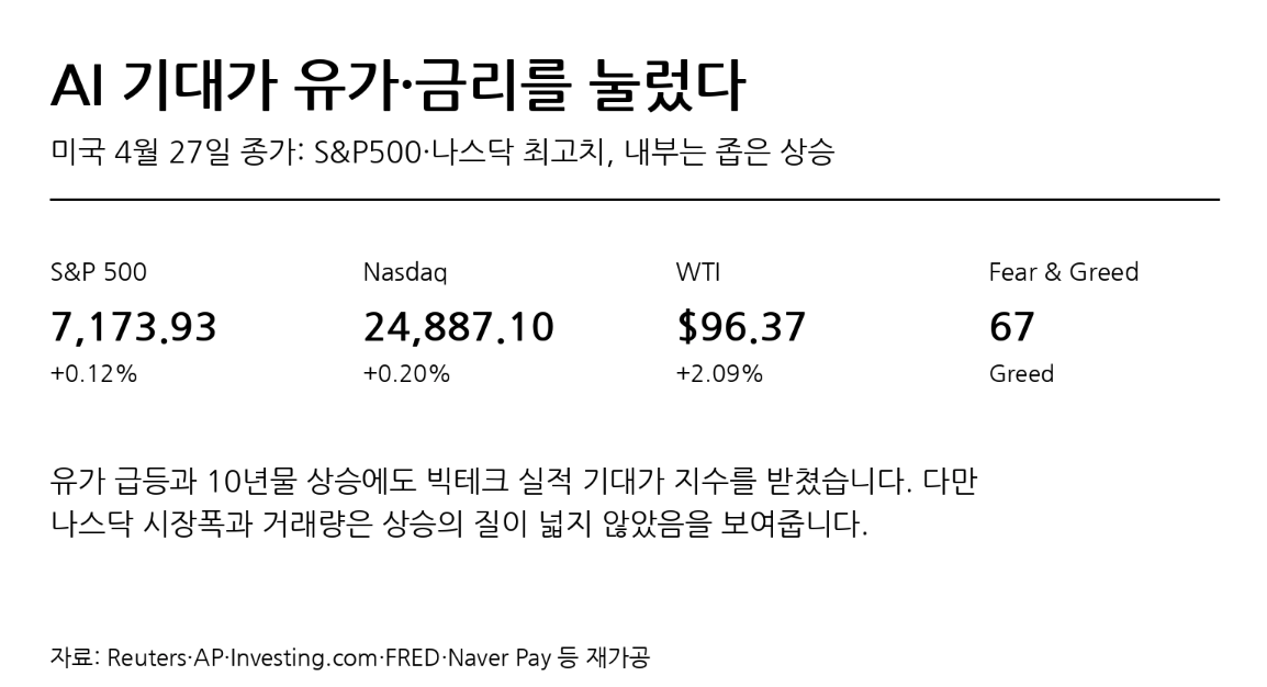 미국시간 4월 27일 뉴욕증시는 겉으로는 다시 “신고가 장”이었습니다. S&P500과 나스닥은 소폭 상승에도 사상 최고 종가를 다시 썼고, 다우는 약보합으로 밀렸습니다. AP도 이날 흐름을 “기록 경신 랠리가 중동 불확실성 속에 속도를 늦춘 장”으로 정리했습니다.