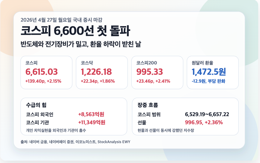 이 글은 2026년 4월 27일 월요일 국내 주식시장 마감 기준으로 작성했습니다. 오늘 국내 증시는 지수장이자 주도 업종장이었습니다. 코스피는 6,615.03으로 2.15% 올랐고, 코스닥은 1,226.18로 1.86% 상승했습니다. 코스피는 사상 처음으로 6,600선을 넘어섰고, 코스닥도 1,200선 위에서 추가 상승을 이어갔습니다.