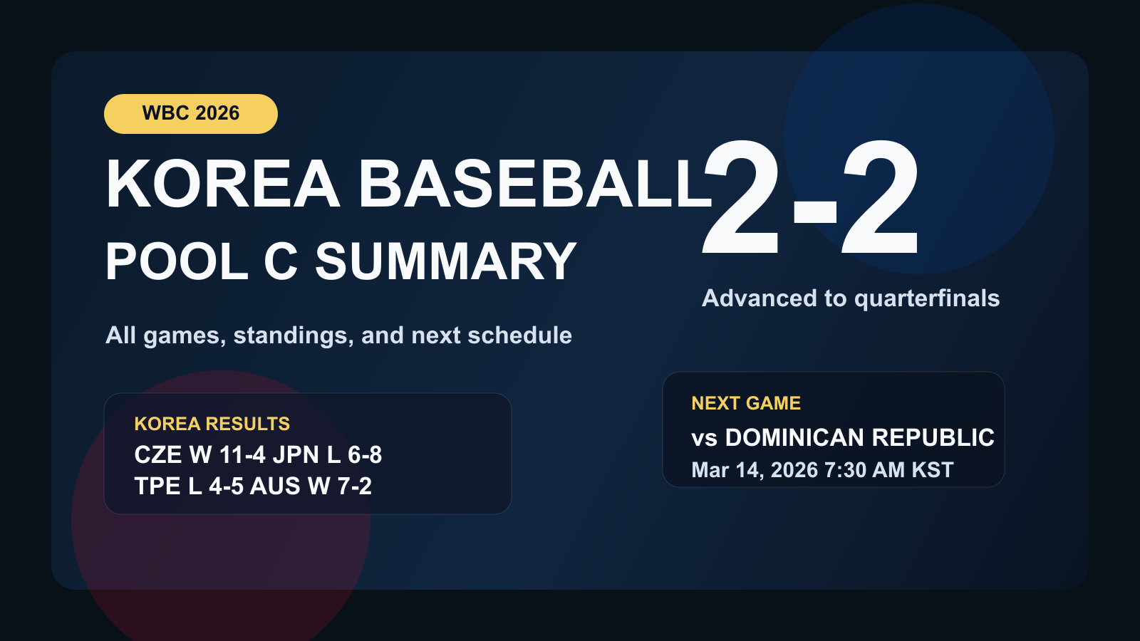 2026년 WBC 한국 대표팀은 일본 도쿄돔에서 Pool C 일정을 치렀습니다. 체코, 일본, 대만, 호주를 차례로 상대했고 결과는 2승 2패였습니다. 기록만 보면 평범해 보일 수 있지만, 실제 내용은 경기마다 성격이 꽤 달랐습니다. 첫 경기 체코전은 화끈한 장타력으로 잡았고, 일본전은 난타전 끝에 밀렸고, 대만전은 연장 끝에 아깝게 놓쳤습니다. 마지막 호주전은 단순한 1승이 아니라 5점 차 이상 승리가 사실상 필요했던 생존전이었습니다.