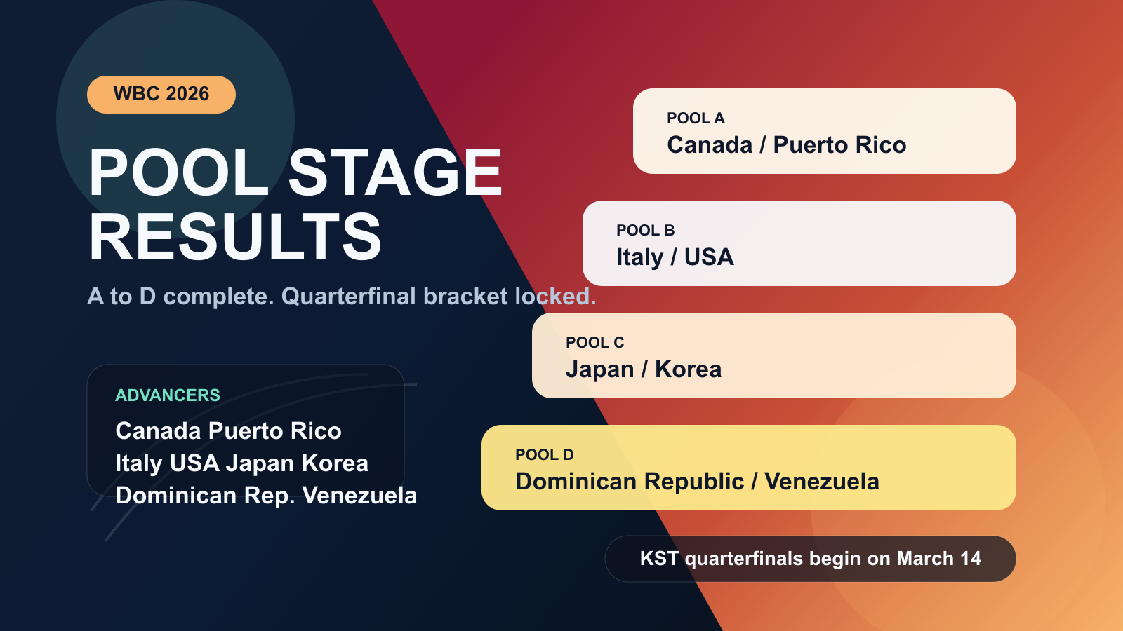 가장 눈에 띄는 포인트는 캐나다의 Pool A 1위 통과, 이탈리아의 Pool B 전승, 한국의 Pool C 타이브레이커 생존, 도미니카공화국의 Pool D 완승입니다. 한국 팬 입장에서는 한국의 8강 진출이 가장 먼저 보이지만, 전체 대진표로 넓혀 보면 8강부터는 사실상 모든 경기가 결승급 카드라고 봐도 무리가 없습니다.